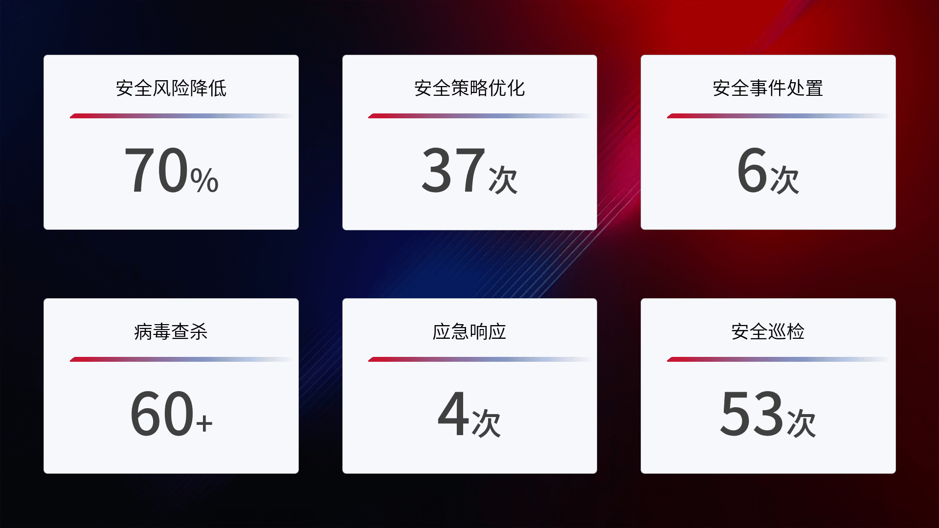 提供全面的安全事件报告体系,,,,包括处置报告、、周报、、、、季度和年度总结,,结合持续监控,,帮助客户深入了解网络安全状况。。
