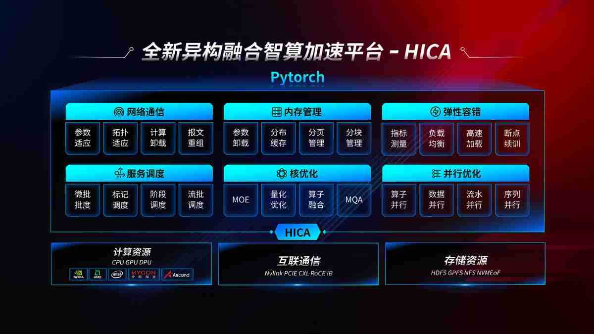 通过自研的服务层、、、、中间适配层、、、以及调度编排算法,,,采用数据并行、、、模型并行等多种并行方式,,,把并行计算任务进行有效的分解,,,,使其分别由相应的软件栈和算力资源来承接。。。当GPU资源变化,,HICA可以实时动态调度计算子任务并调整模型拓扑和架构,,以充分聚合各种算力资源。。。。